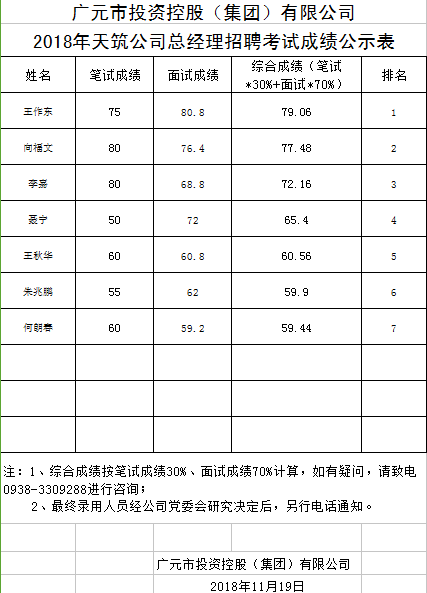 2018年天筑公司總經(jīng)理招聘考試成績公示表
